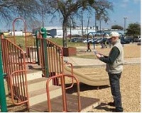 ![]() Playground inspection | Playground Checkup – After months of disuse, it might be a good time to have us perform a quick maintenance inspection, evaluate groundcover, etc. to ensure your set is and its surroundings are up to recommended playground guidelines. Signage – Per CDC guidelines and NRPA recommendations, playgrounds should display signage encouraging social distancing, one of the most effective measures for preventing COVID-19 transmission. Signs can be mounted on an existing post or fence, or we can provide a mounting post. The method of installation will also make it easy to remove the sign once social distancing is no longer recommended. | ![]() Signage |